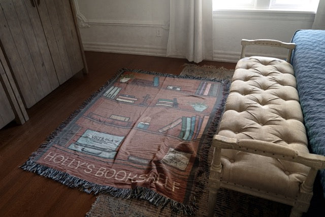 A Bookshelf Blanket with a personal touch. With Christian artwork and a cross, this hand drawn personalized bookshelf blanket is at home in any homeschool, library, living room, snug or wherever you curl up with great literature.